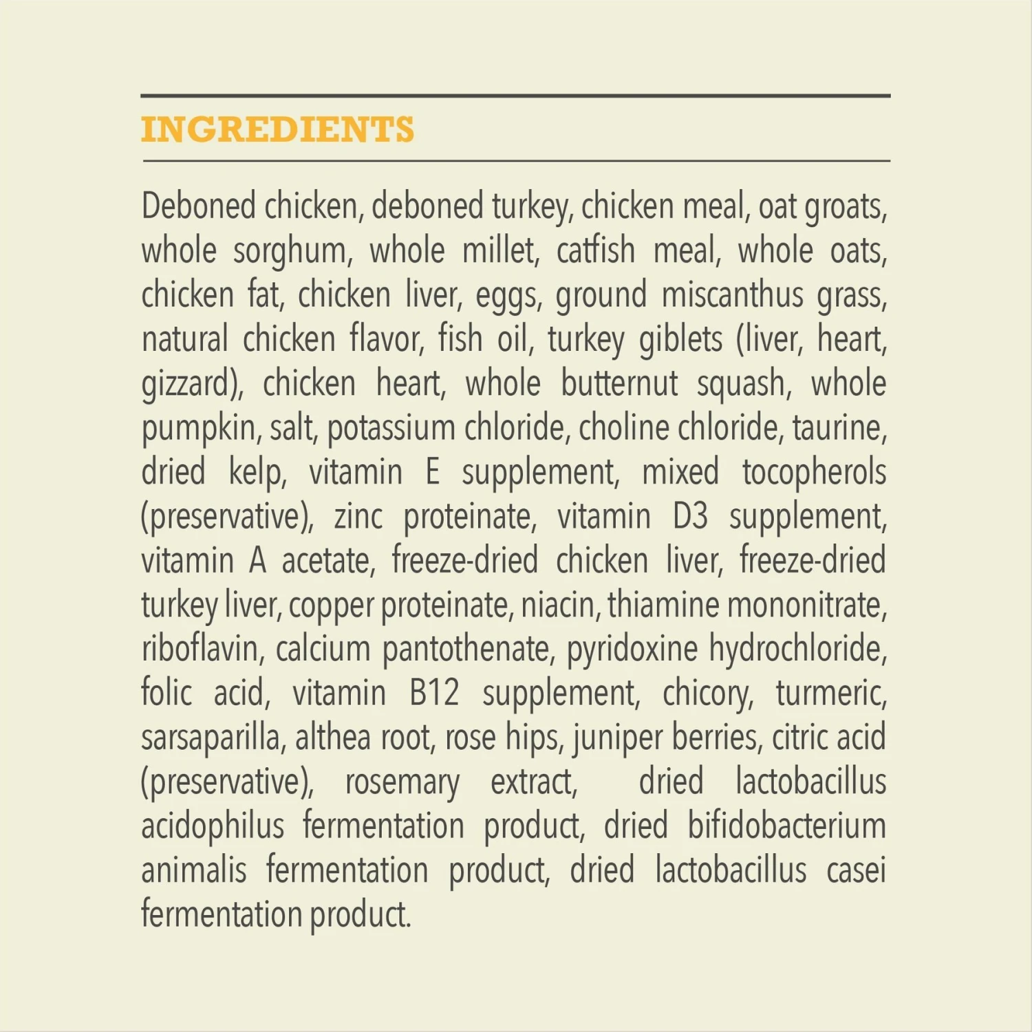 - Made with free-run chicken, turkey, and eggs, for 60% animal ingredients and 40% wholesome grains, veggies, fruits, and nutrients.