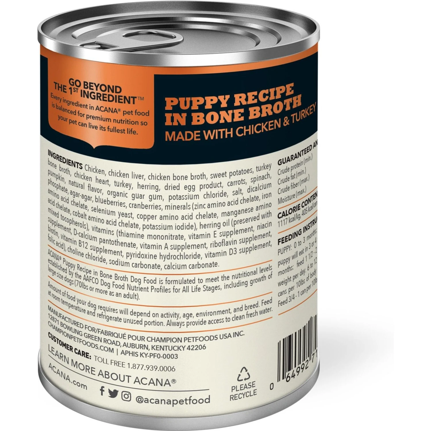 ACANA Premium Pate Puppy Recipe in Bone Broth Grain-Free Wet Dog Food, 12.8-oz can, case of 12—Not only is the ACANA Premium Pate Puppy Recipe in Bone Broth Grain-Free Wet Dog Food su-paw tasty, it’s made with premium ingredients to give your furbaby the nutrition he needs. This recipe is crafted to nourish your best friend’s development with premium ingredients like chicken, turkey and herring, and those are balanced with yummy veggies and fruit. A savory bone broth base adds a flavor that your pup will love. The fresh ingredients are preserved only by refrigeration, and raw ingredients are frozen at their peak fur-eshness for extra delicious taste. This recipe is grain-free, too, paw-fect for pups with sensitive tummies.