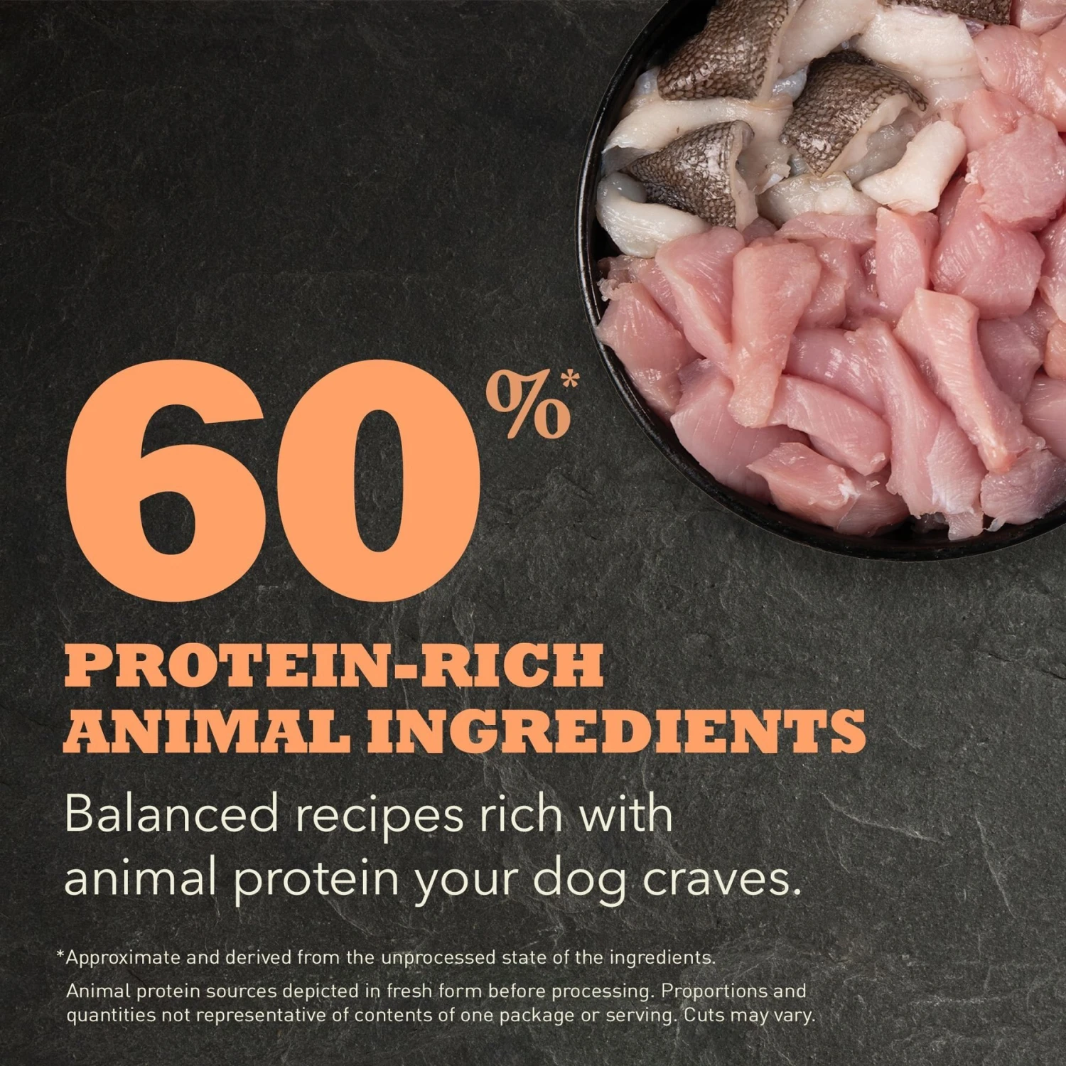 ACANA Puppy Recipe Grain-Free Dry Puppy Food, 4.5-lb bag—ACANA Puppy Recipe Grain-Free Dry Puppy Food is specially crafted with protein and fat from quality animal protein to support your growing puppy’s development. It contains 60% quality animal ingredients, including free-run chicken and turkey, and cage-free eggs, plus 40% fruits, vegetables and botanicals like whole pumpkin. There are also vitamins, minerals, natural preservatives and probiotics added, and zero artificial colors, flavors or preservatives. ACANA always uses premium ingredients from a curated group of trusted farmers, ranchers and fishers, and every batch of food is made in their state-of-the-art Kentucky kitchen.