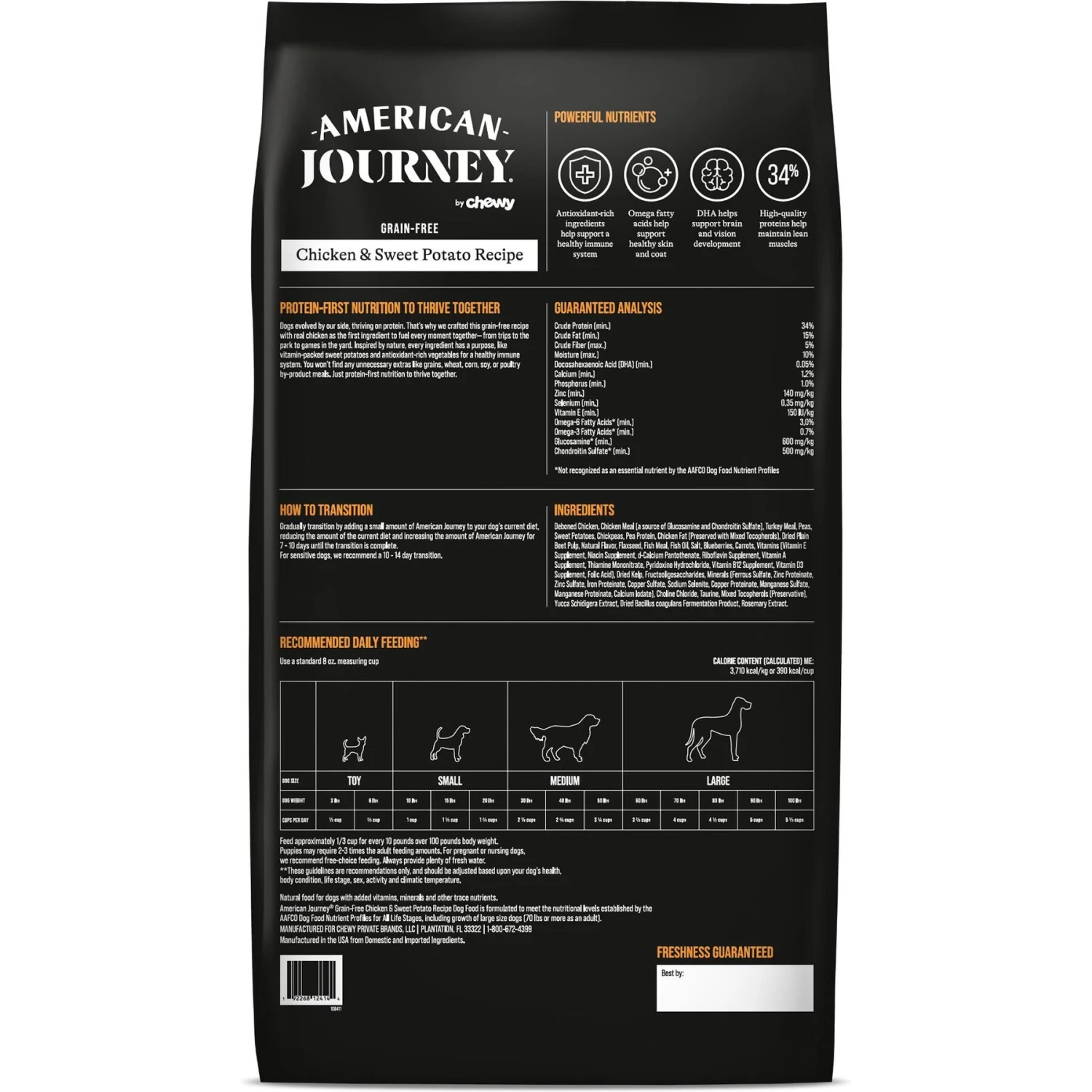- American Journey Chicken and Sweet Potato Recipe is made with chicken as the #1 ingredient, which provides amino acids to support lean muscles, energy and overall health.