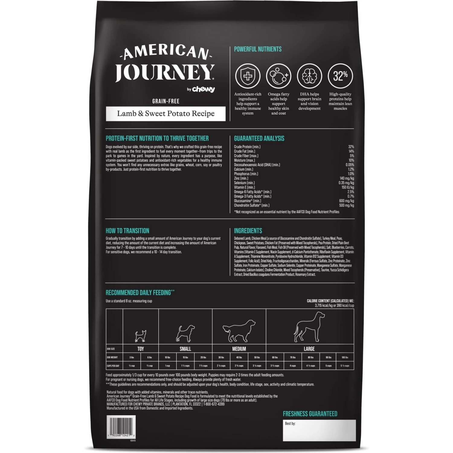 - American Journey Lamb and Sweet Potato Recipe is made with lamb as the #1 ingredient, which provides amino acids to support lean muscles, energy and overall health.