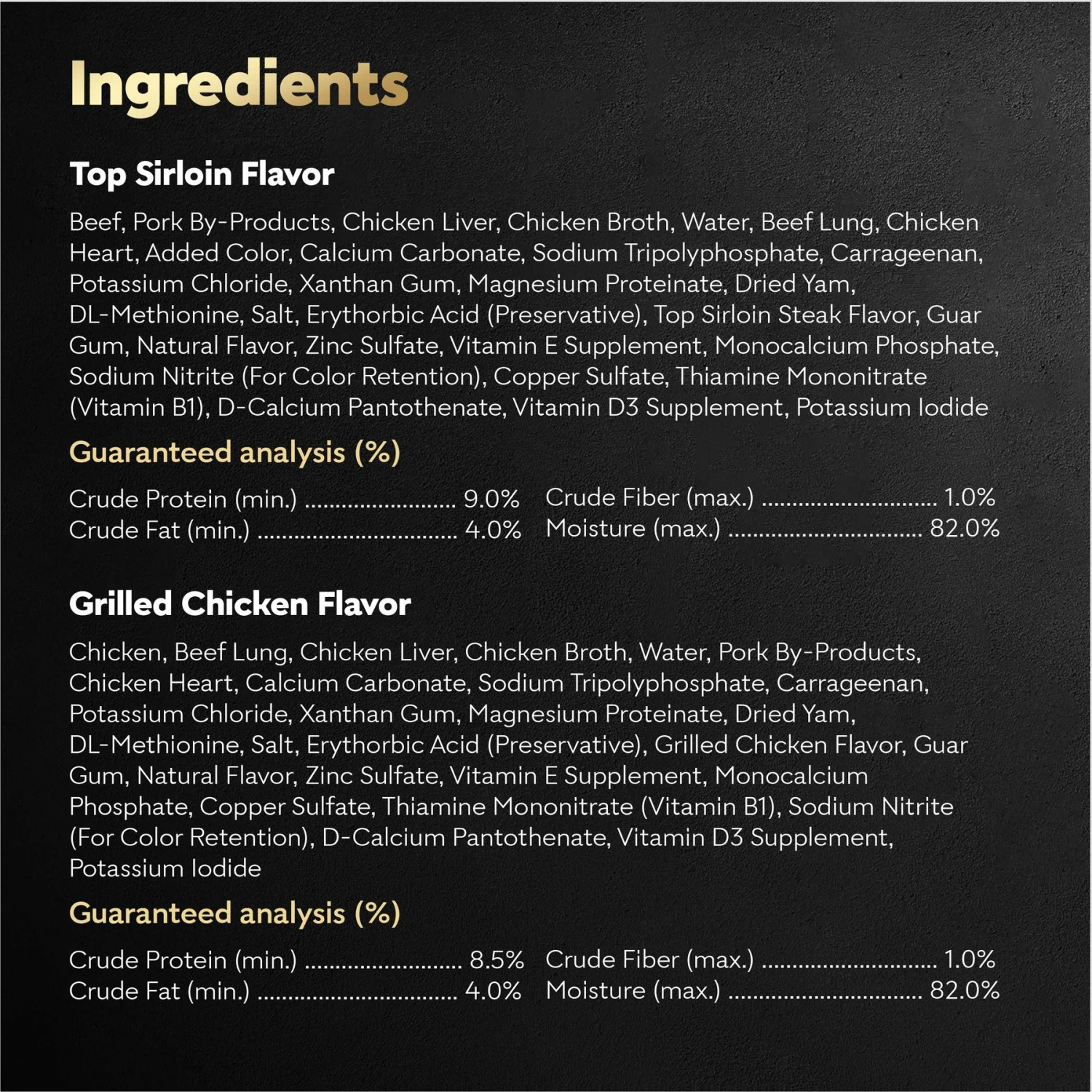 | Flavor | Turkey, Chicken & Veal, Variety Pack: Steak Lovers 2, Variety Pack: Steak, Filet Mignon, Variety Pack: Poultry Lovers, Top Sirloin, Chicken & Liver, Variety Pack: Beef, Steak & Chicken, Variety Pack: Breakfast & Dinner, Porterhouse Steak, Variety Pack: Poultry, Variety Pack: Steak & Chicken Lovers, Variety Pack: Classic, Variety Pack: Breakfast, Variety Pack: Steak & Chicken, Oven Roasted Chicken, Lamb, Grilled Steak and Eggs, Grilled Chicken, Smoked Bacon & Egg, Variety Pack Steak Lovers 1, Variety Pack: Class & Home Delights, Beef |