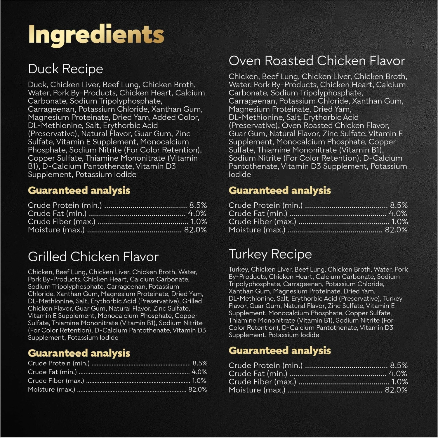 | Flavor | Turkey, Chicken & Veal, Variety Pack: Steak Lovers 2, Variety Pack: Steak, Filet Mignon, Variety Pack: Poultry Lovers, Top Sirloin, Chicken & Liver, Variety Pack: Beef, Steak & Chicken, Variety Pack: Breakfast & Dinner, Porterhouse Steak, Variety Pack: Poultry, Variety Pack: Steak & Chicken Lovers, Variety Pack: Classic, Variety Pack: Breakfast, Variety Pack: Steak & Chicken, Oven Roasted Chicken, Lamb, Grilled Steak and Eggs, Grilled Chicken, Smoked Bacon & Egg, Variety Pack Steak Lovers 1, Variety Pack: Class & Home Delights, Beef |