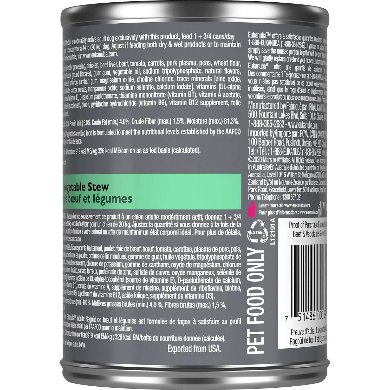 Eukanuba Adult Beef & Vegetable Stew Canned Dog Food, 12.5-oz, case of 12—You live an active life, and so does your dog. From running and hiking to sporting and agility competitions, your partner takes it on right by your side. With Eukanuba Beef & Vegetable Stew Adult Wet Dog Food, you can help fuel his active lifestyle and all of his adventures. Made with high-quality animal proteins, this scientifically formulated wet food helps build strong muscles and is 100% complete and balanced. Feed this nutritious beef and vegetable stew alone or add it to your dog’s favorite kibble as a special meal topper. Eukanuba Beef & Vegetable Stew Adult Wet Dog Food helps keep him running strong to live the healthy, active life that every dog deserves.