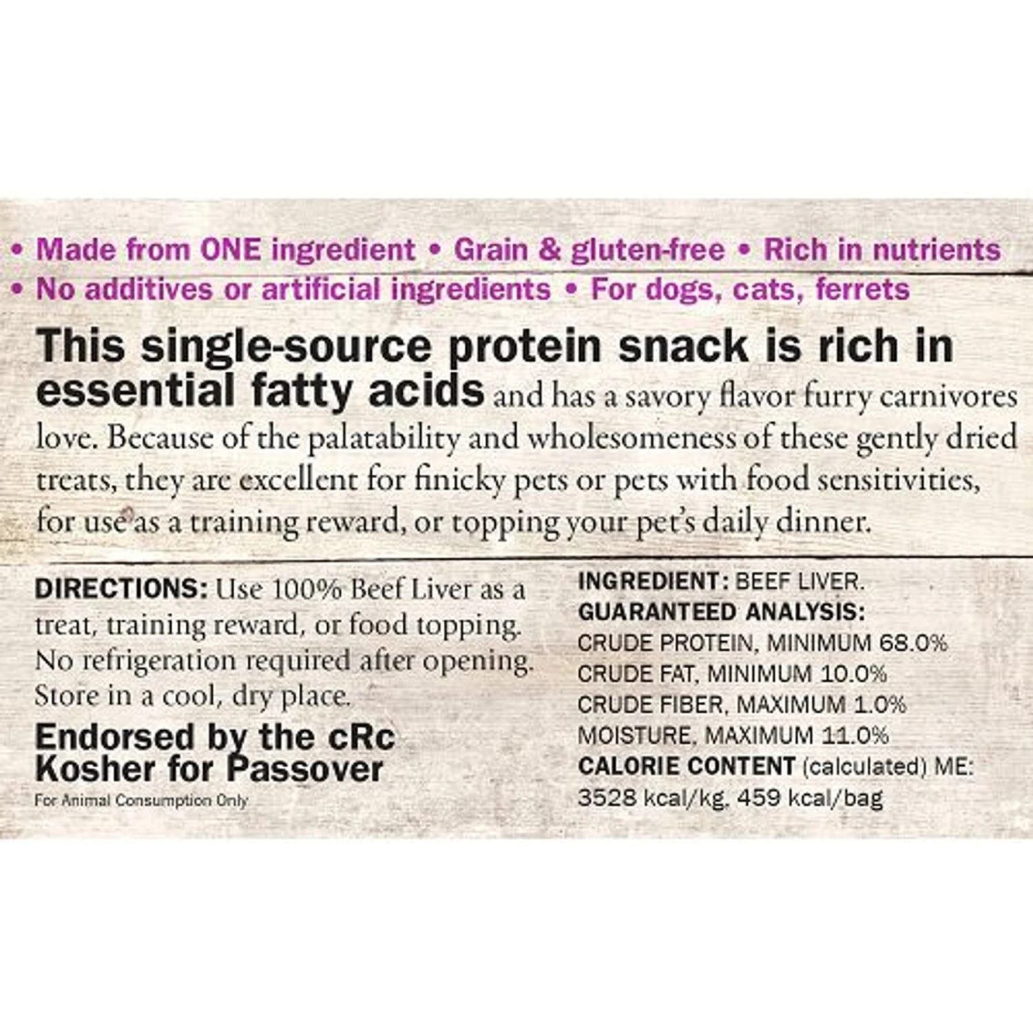 - Single ingredient beef liver treats are paw-fect as a treat, training award, food topper or savory snack.