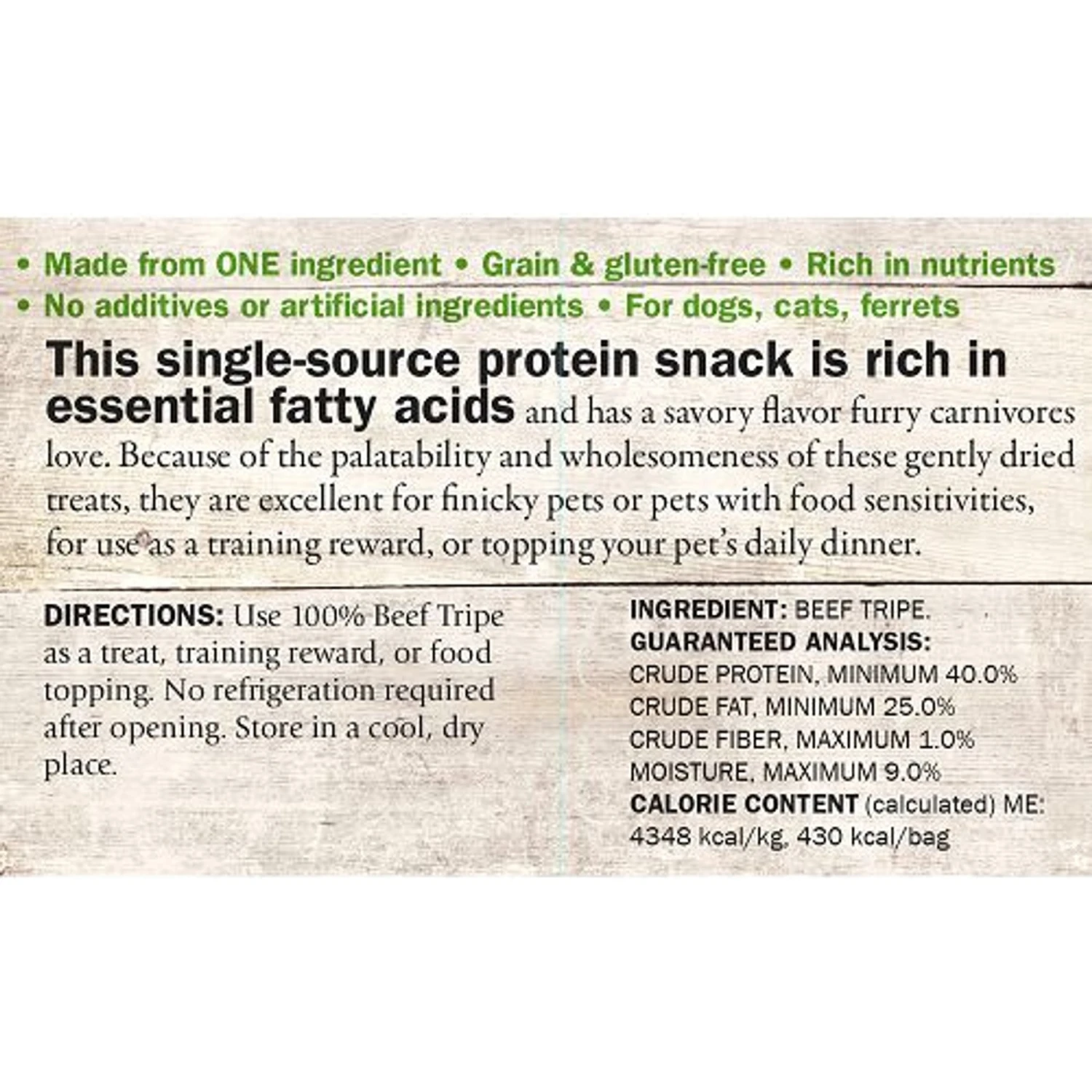 - Single ingredient beef tripe is a nutrient dense treat that can be a treat, training award, food topper, or reconstituted in warm water for 3-5 minutes for a savory snack.