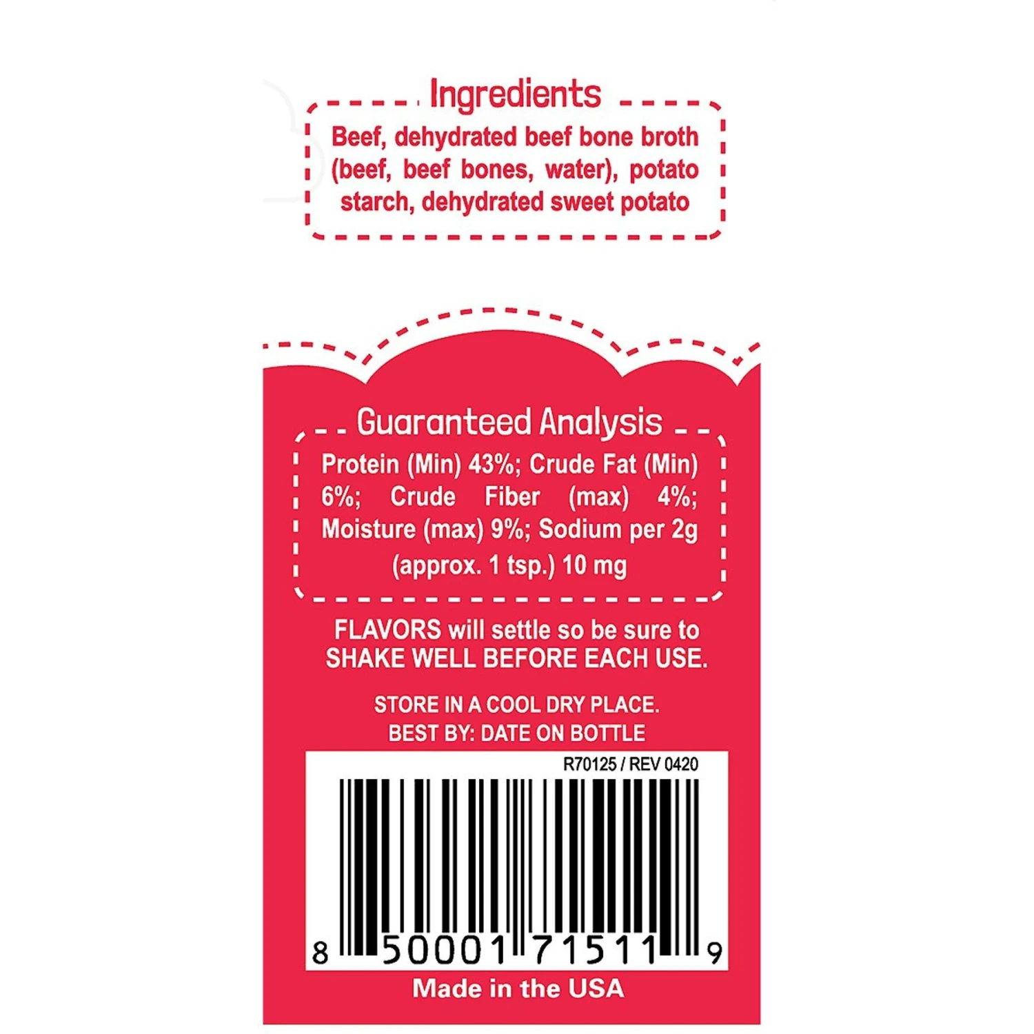 - Grain-free food topper powder is made with real beef, beef broth and sweet potatoes for a flavor boost in every sprinkle.