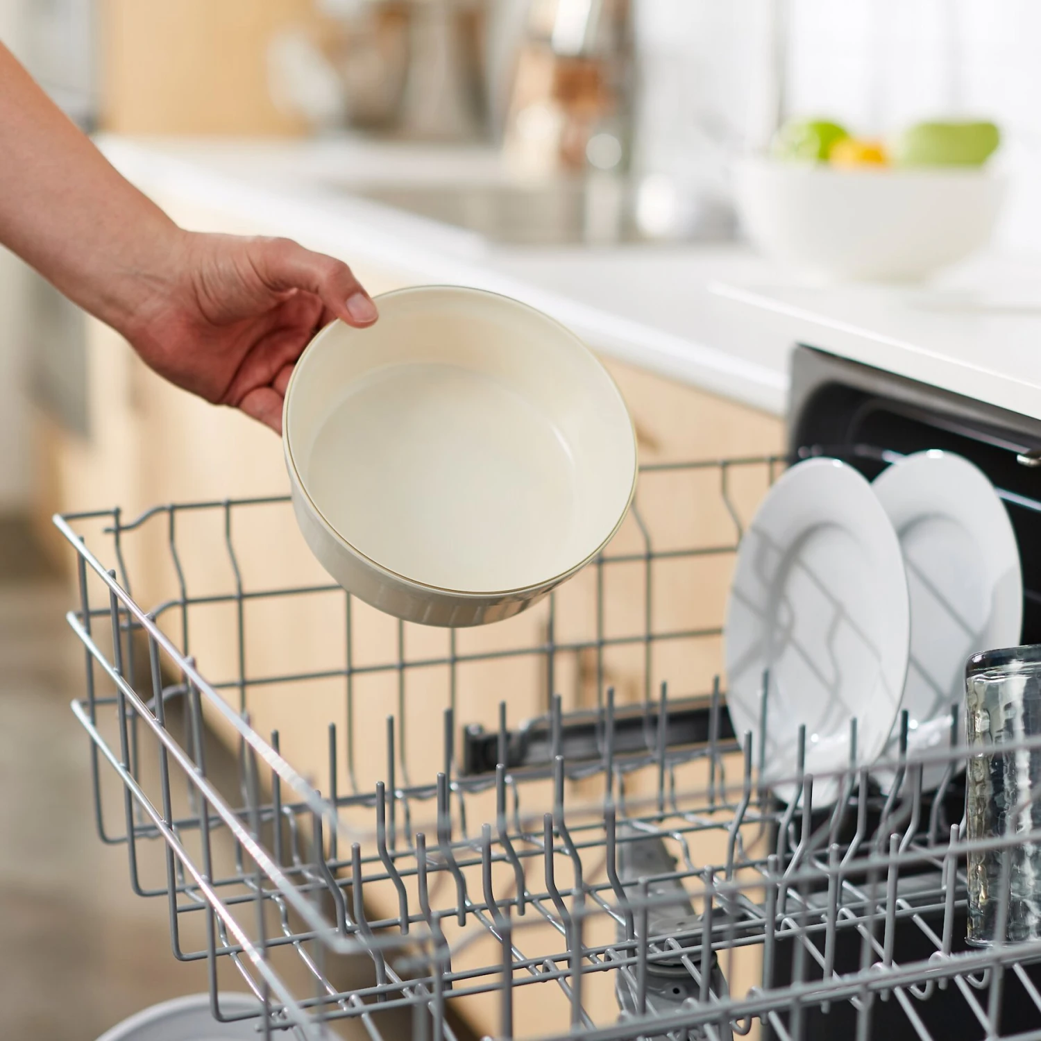 - Cream-colored melamine bowl with a tasteful gold trim accent.