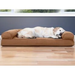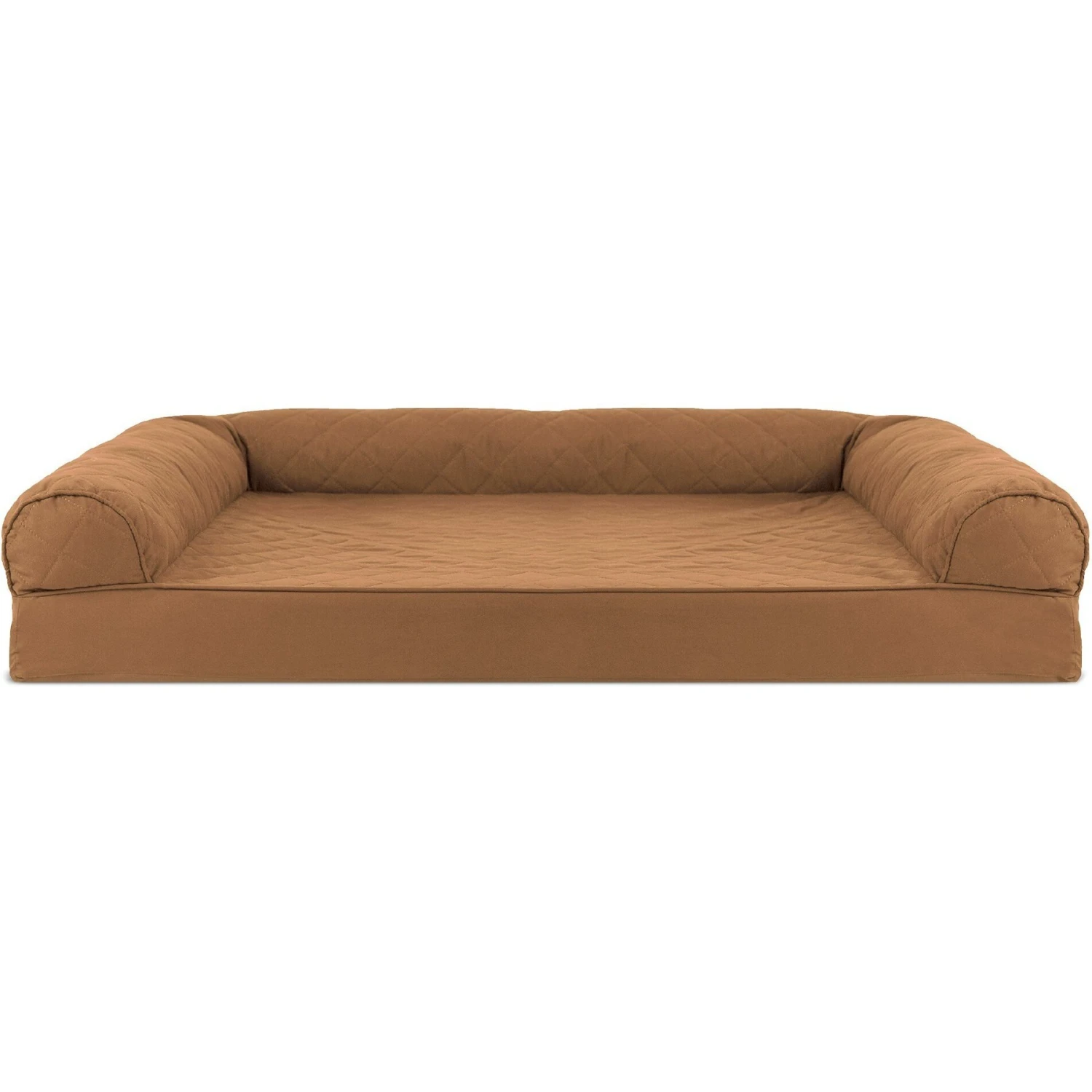 - Sofa-style pet bed with a smooth, quilted sleeping surface.