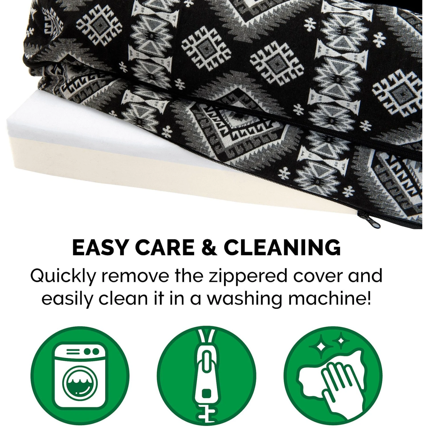 - Zippered cover is removable and machine washable for easy cleaning.