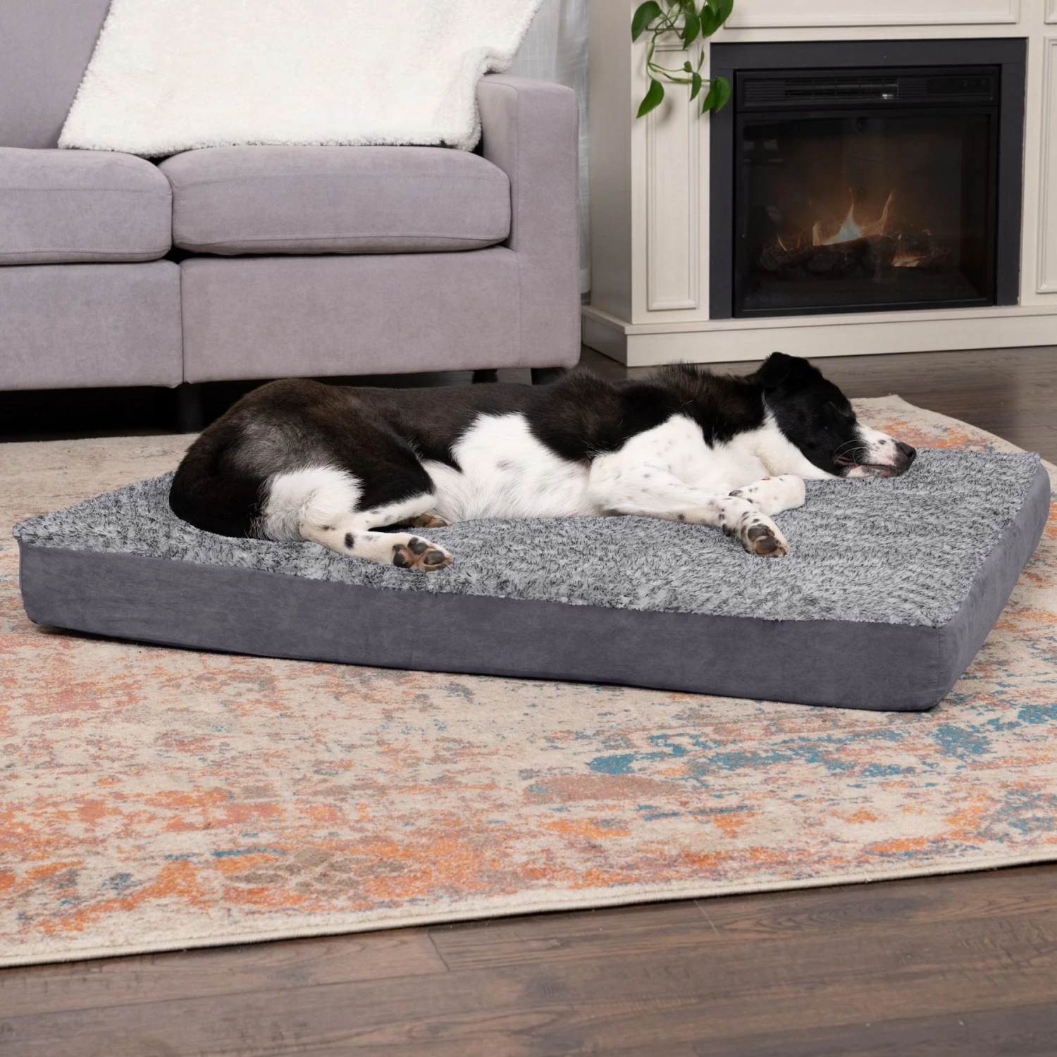 Give your best friend the support they need with a luxuriously soft FurHaven Two-Tone Faux Fur & Suede Deluxe Orthopedic Mat pet bed. Solid orthopedic foam provides your pet with extra support and cushioning for maximum comfort. This full support solid slab orthopedic foam provides even more support and comfort. Your pet will benefit from the orthopedic foam which is designed to evenly distribute weight and alleviate painful pressure on muscles and joints. Better rest for your pet can lead to improved overall health. Easy step-on mat design for smaller, older or disabled pets. The cover is zippered and removable for easy machine-washing, while the foam core is hand wash. This pet bed is ideal for bigger dogs (or smaller dogs to share) who like to sprawl & snooze the day away.