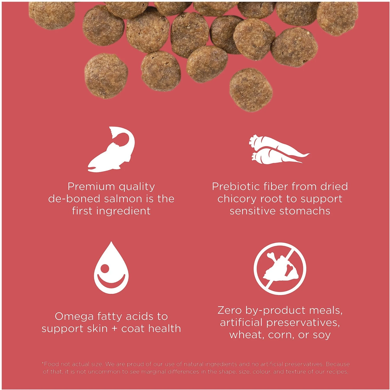 - Deboned salmon is the #1 ingredient and fiber from the dried chicory root supports sensitive stomachs. This recipe is made without by-product meals or artificial preservatives.