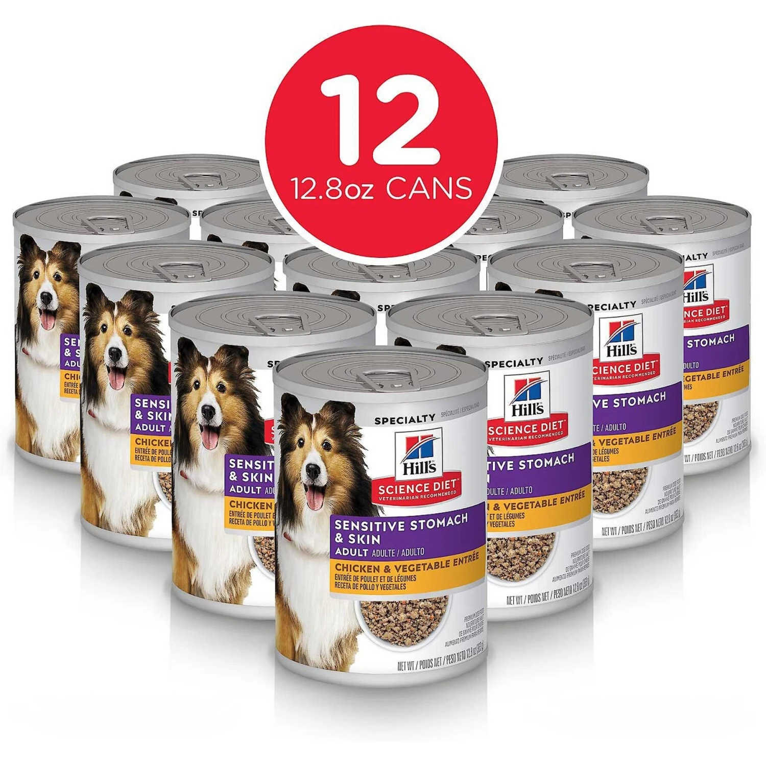 Hill’s Science Diet Adult Sensitive Stomach & Skin Chicken & Vegetable Entrée Canned Dog Food & Hill’s Science Diet Adult Sensitive Stomach & Skin Grain-Free Salmon & Vegetable Entree Canned Dog Food