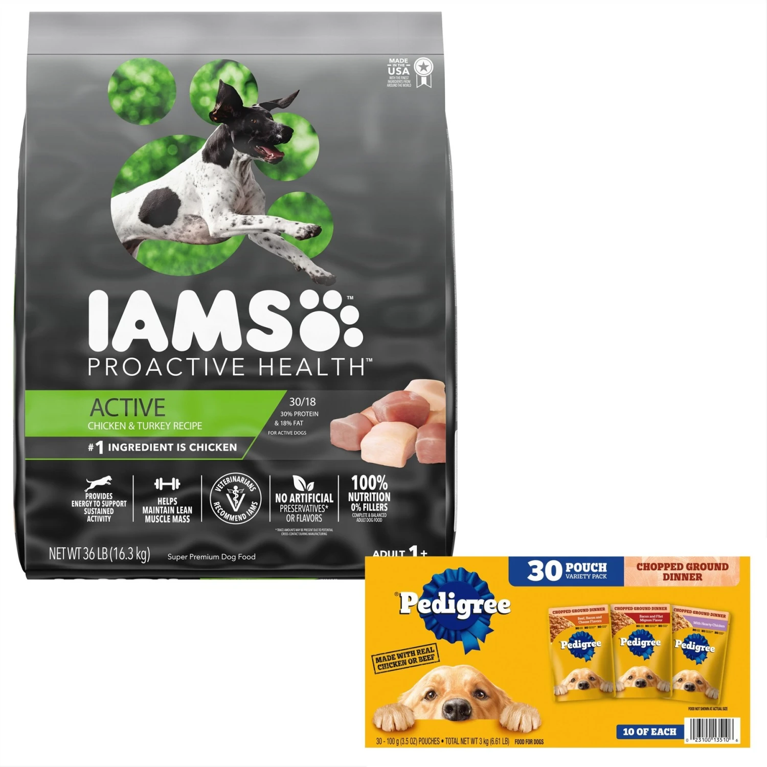 Iams Proactive Health Active Chicken & Turkey Recipe High Protein Adult Dry Dog Food & Pedigree Chopped Ground Dinner Variety Pack Adult Wet Dog Food