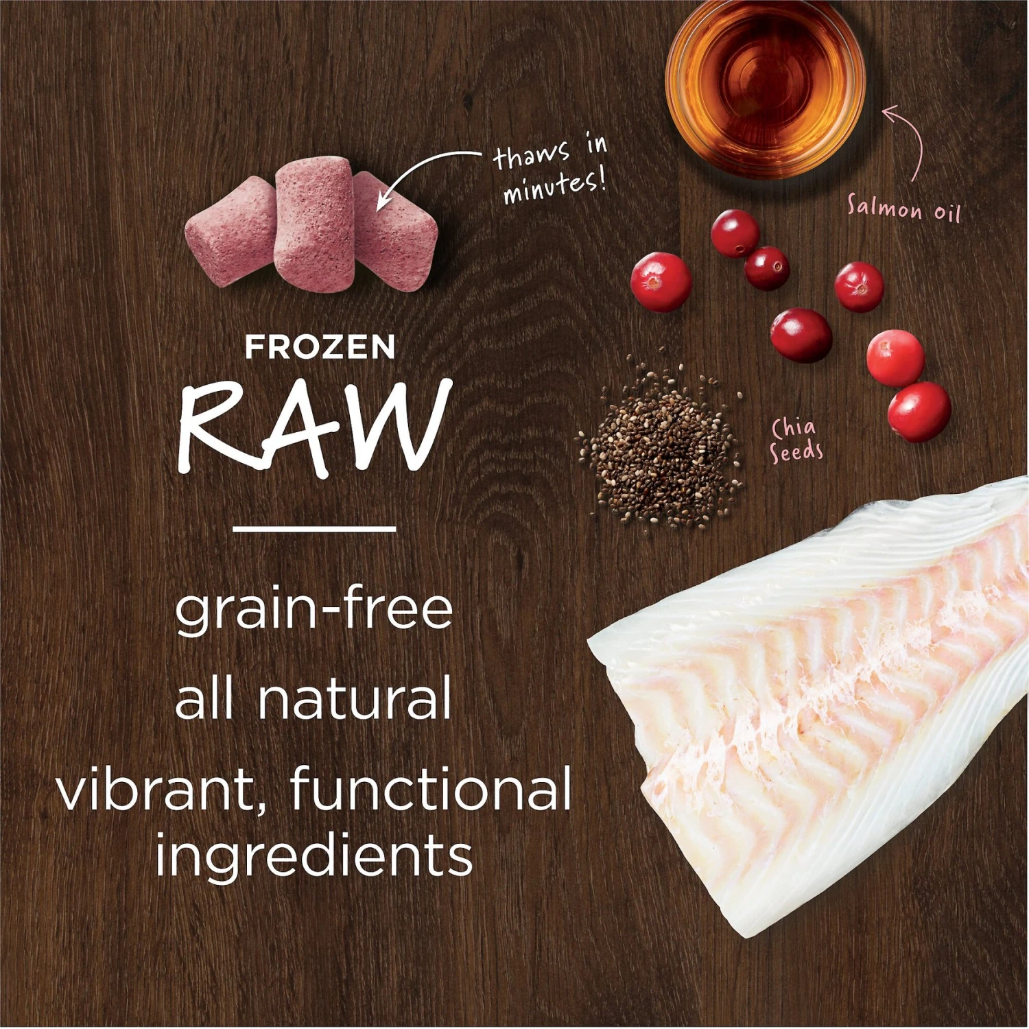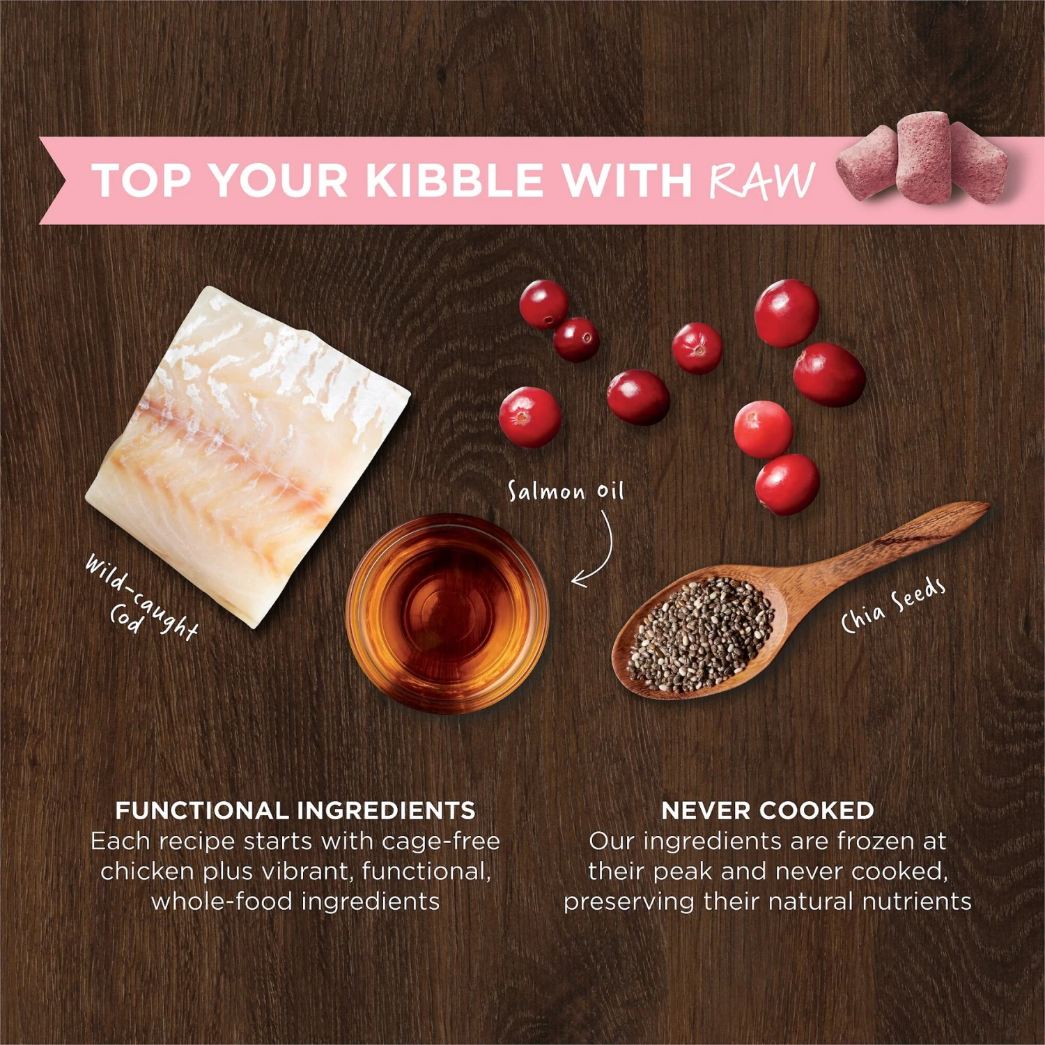 - Features raw ingredients for a healthy food topper.