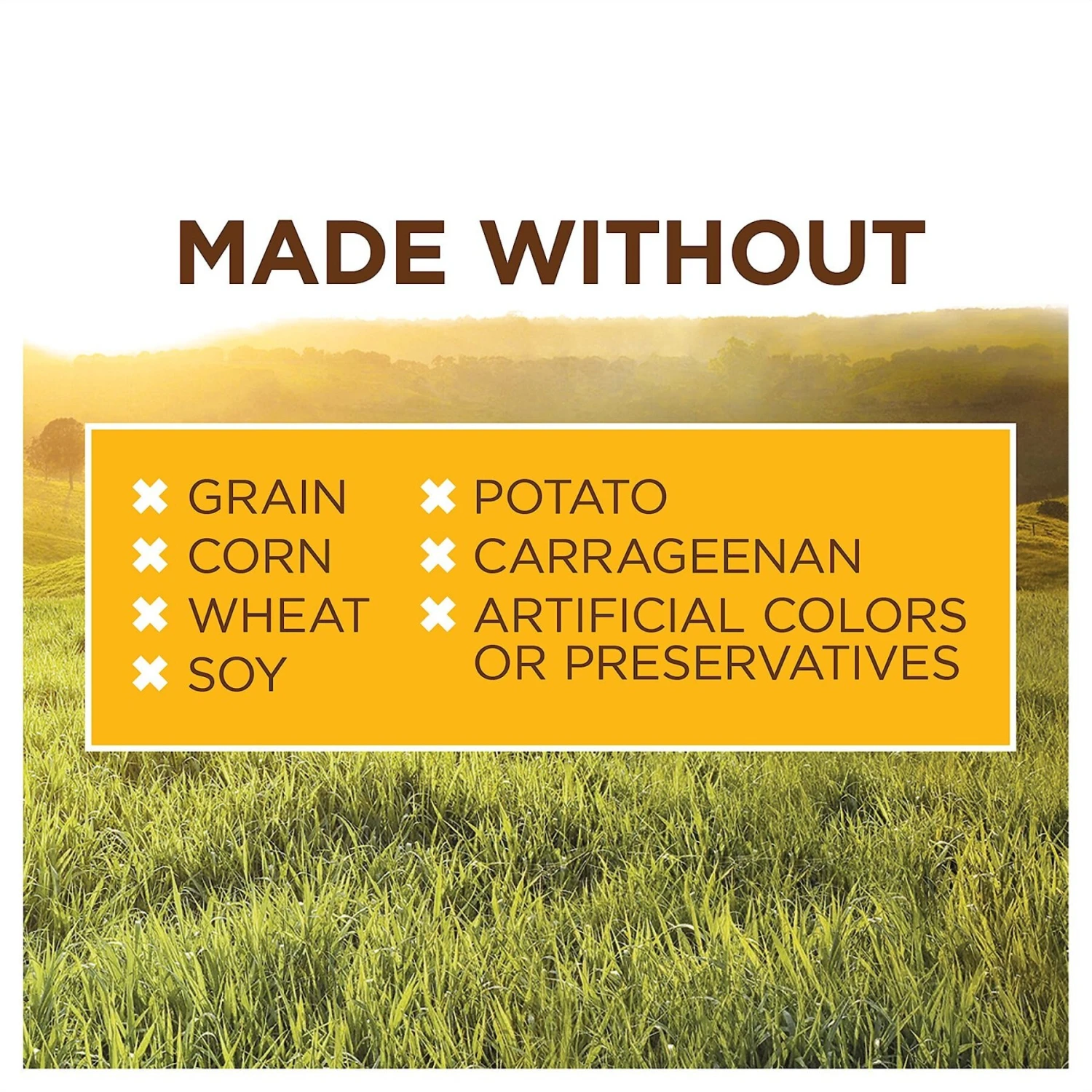 - Free of grain, potato, corn, wheat, soy, by-product meal, artificial colors or preservatives.