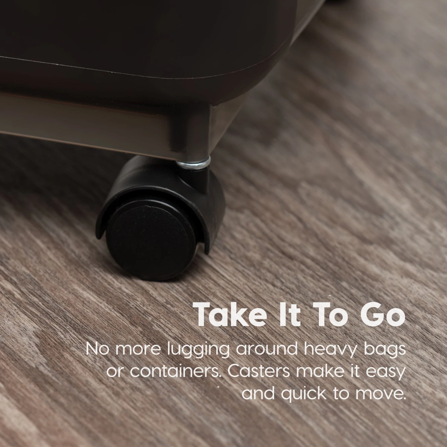 - Store the bin on a shelf, or attach the optional caster wheels to easily roll it from storage to your pet’s food bowl.
