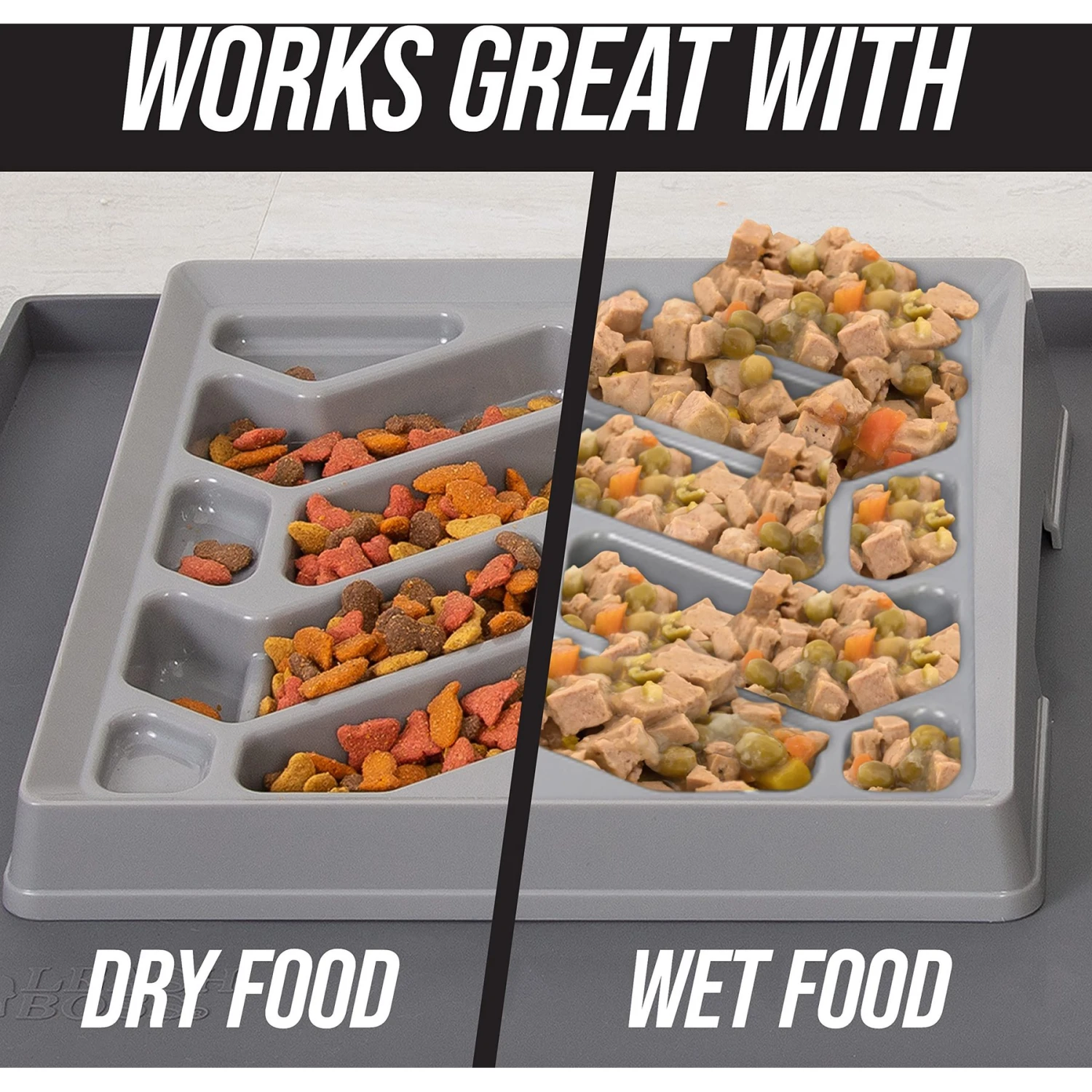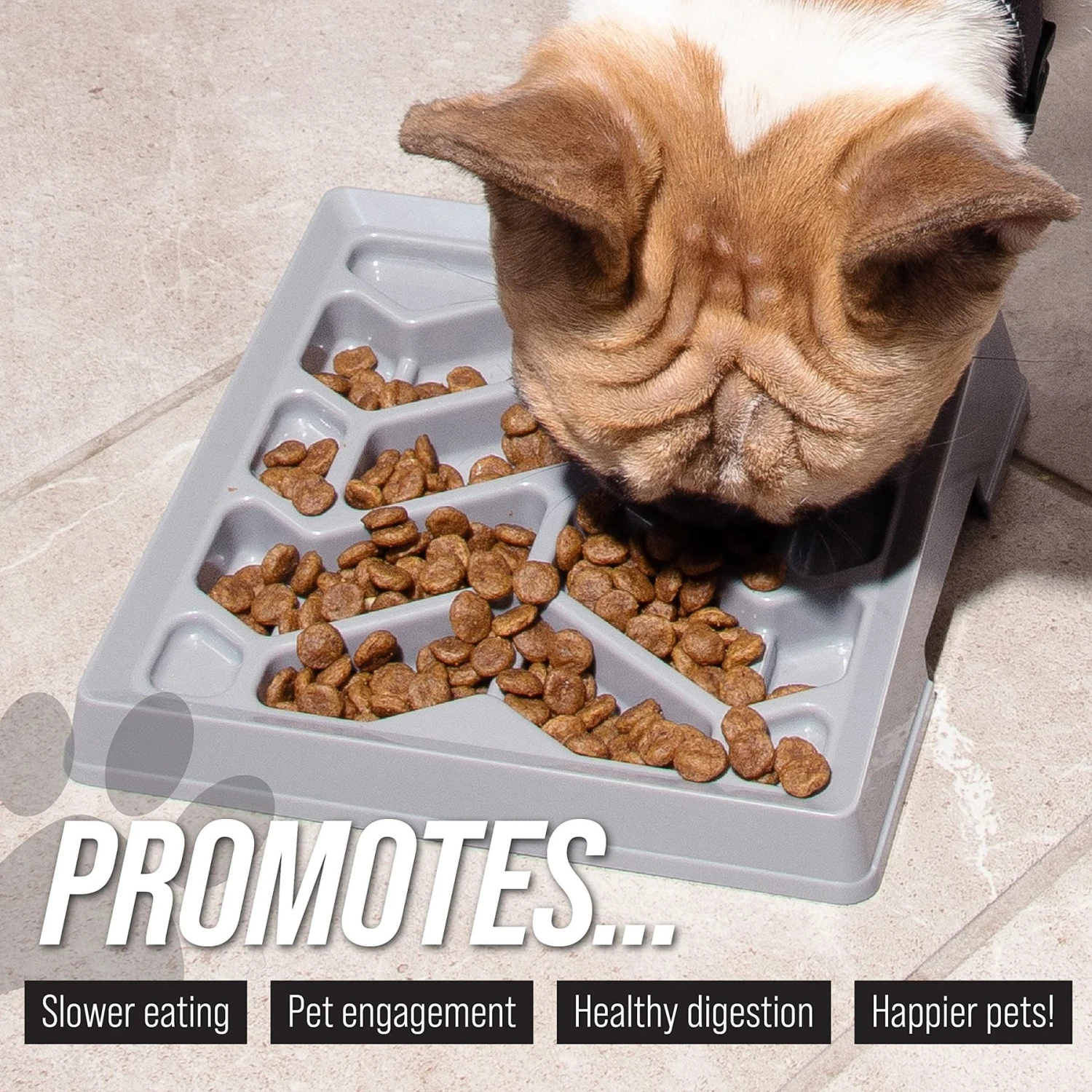 - Slow feeder designed for short-snout dogs like pugs and Boston terriers, as well as for cats.