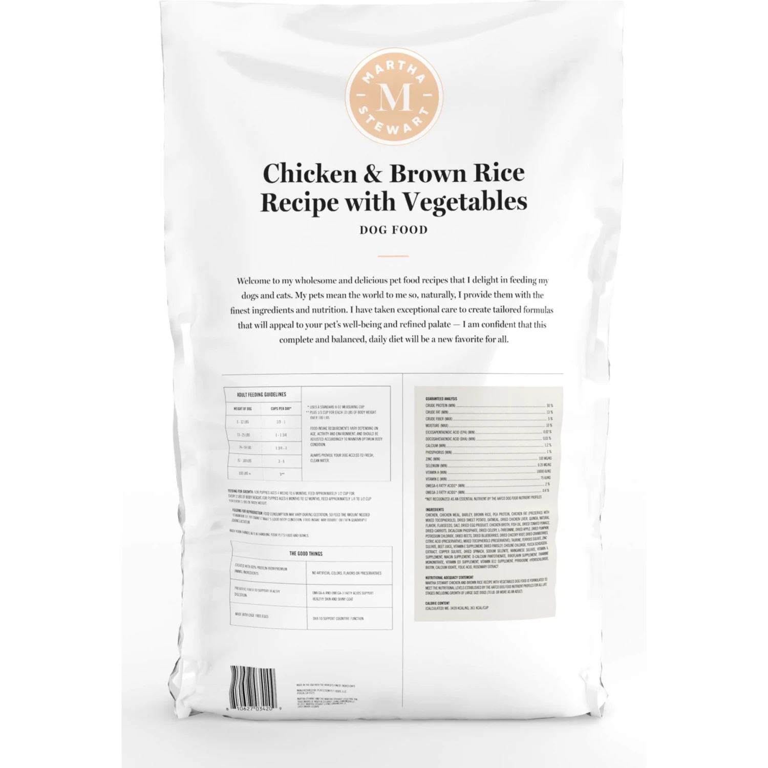 This proven palate pleaser is packed with wholesome, nutritious ingredients that fuel your pet’s everyday adventures. The Martha Stewart Chicken and Brown Rice Recipe with Garden Vegetables Dry Dog Food features real, deboned chicken and cage-free eggs to provide the protein and amino acids your pet needs for maintaining lean muscle. Hearty brown rice and oatmeal offer the prebiotic dietary fiber needed for optimal gut health, and wholesome fruits and veggies like pumpkin, spinach and blueberries deliver additional fiber, plus beneficial phytonutrients and antioxidants. Omega fatty acids such as omega-3 and omega-6 are generously sourced to support healthy development of the brain and eyes as well as the optimal care of your best friend’s skin and coat. The eco-friendly air-dry process yields a moister, superior texture and savory bouquet that is a trusted mealtime favorite. This 100% complete and balanced recipe contains no corn, wheat, soy, preservatives or artificial colors, making it a sensible choice for dogs who are prone to food sensitivities.