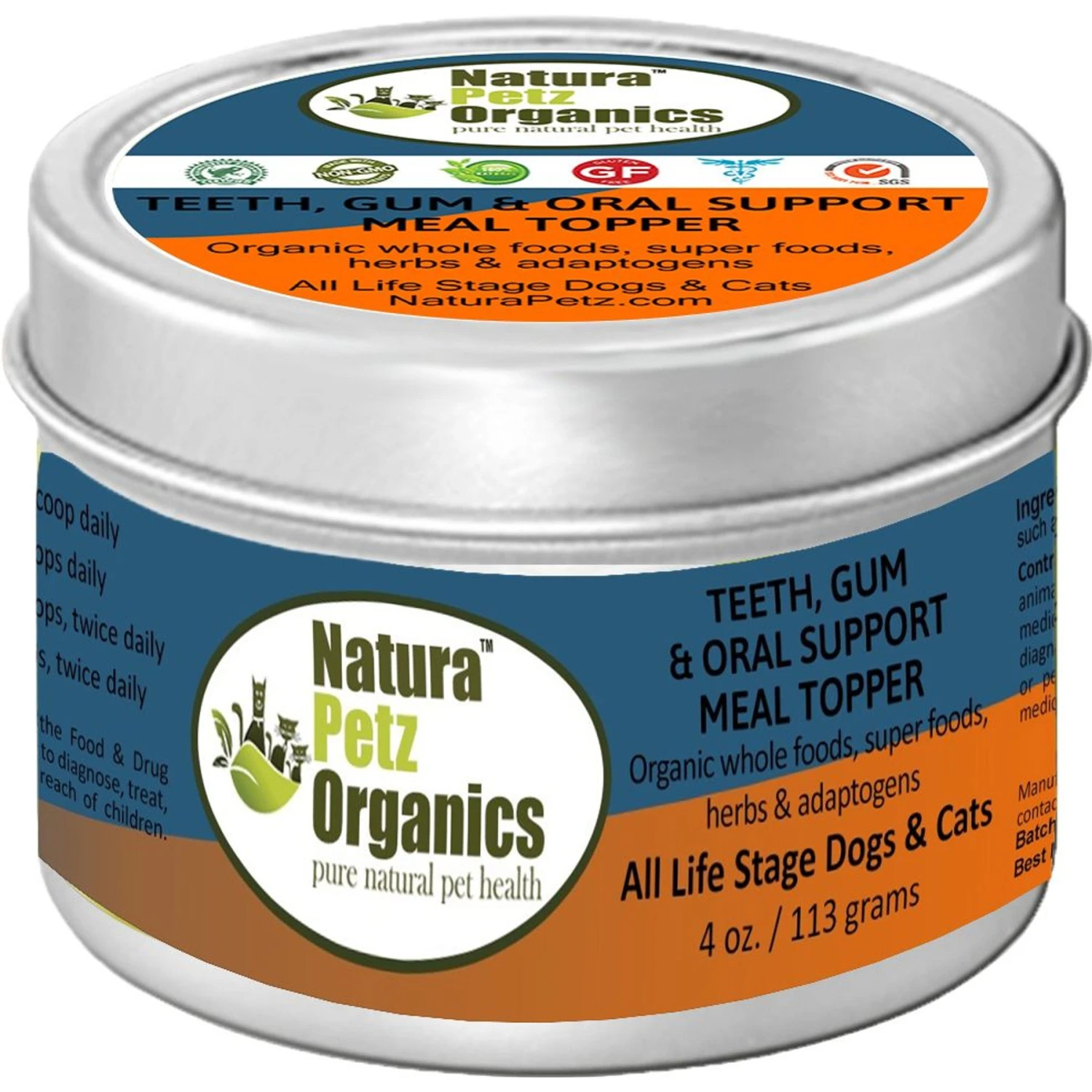 Natura Petz Organics Teeth, Gum & Oral Support Turkey Flavored Powder Dental Supplement For Dogs, 4-oz Tin