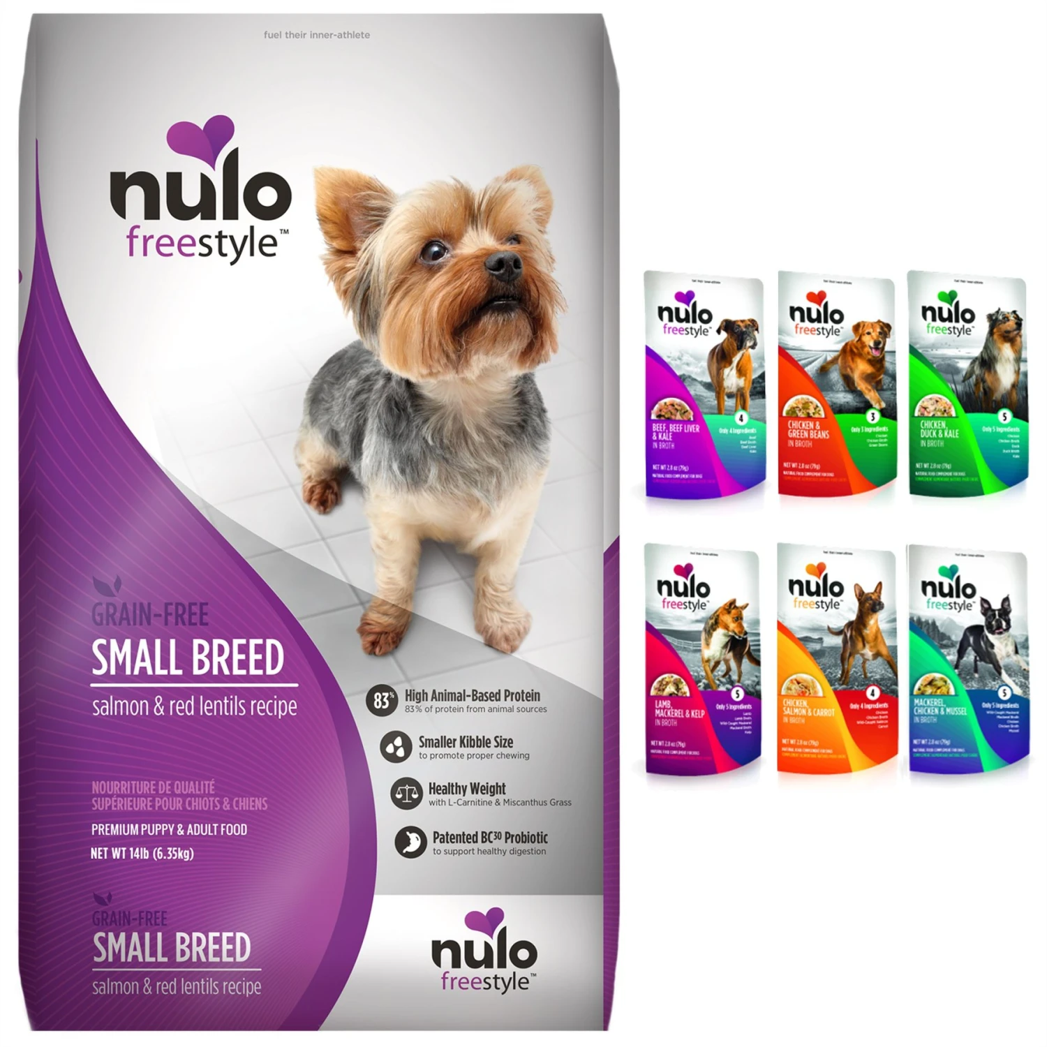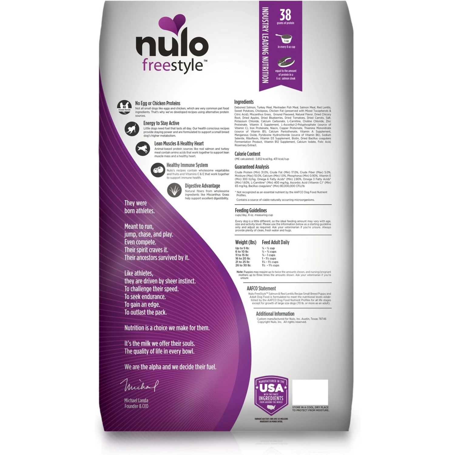 Nulo Freestyle Salmon & Red Lentils Small Breed Grain-Free Dry Dog Food, 14-lb bag—What small dogs lack in size, they make up for in energy! Small Breed dogs have special nutritional needs. This health-conscious Small Breed recipe is formulated to support a small breed dog’s higher metabolism. With 84% of protein coming from real meat like salmon, turkey, and lamb, your small dog is sure to get the nutrition he or she deserves. Made in an extra small kibble size designed to deliver a taste and texture that your small dog will love.