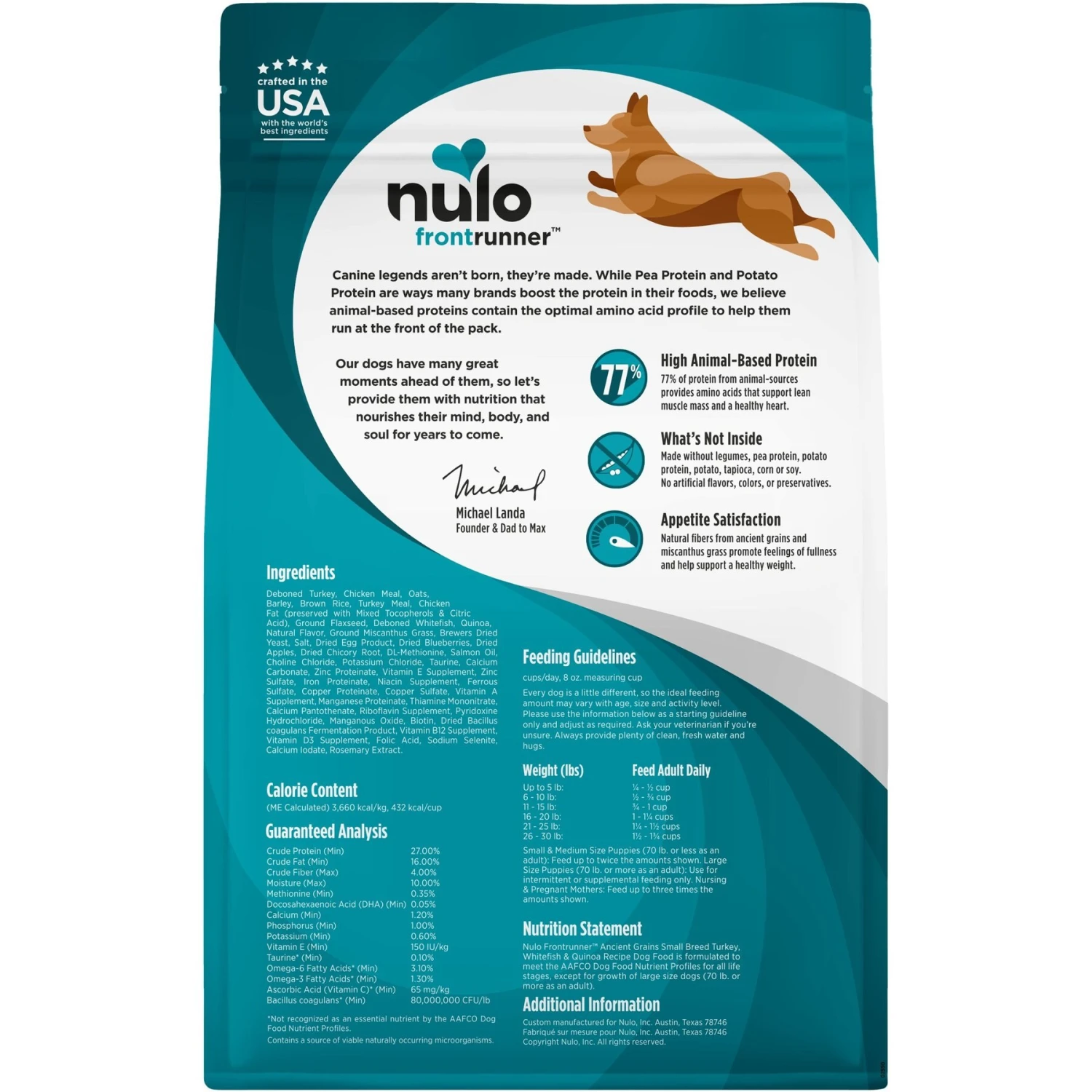 - 77% animal-based protein provides amino acids that support lean muscle mass and a healthy heart in your small dog.