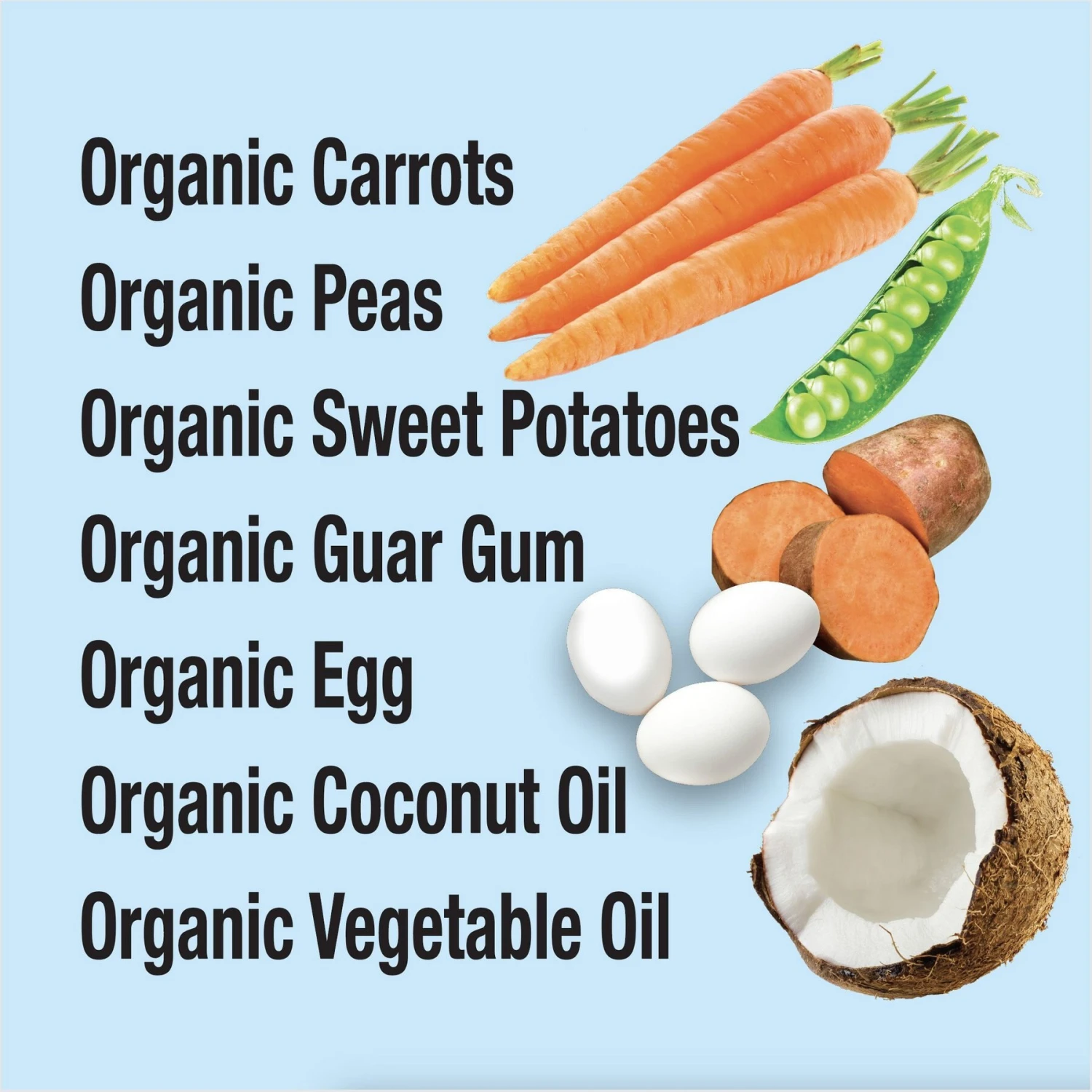 - Organic Carrots, Organic Peas, Organic Sweet Potatoes, Organic Guar Gum, Organic Egg, Organic Coconut Oil, Organic Vegetable Oil enhances this diet.