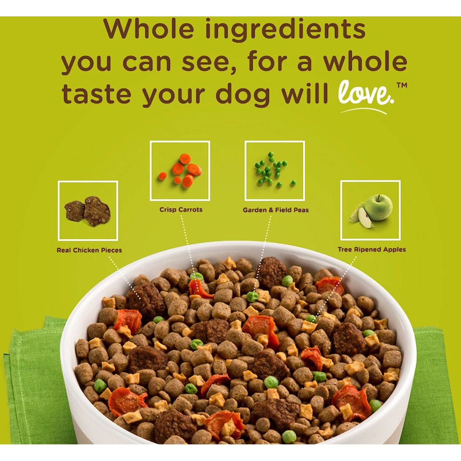 - This wholesome dry dog food is crafted with real ingredients you can see, including coin-cut carrots, field peas, crisp apples and real pieces of chicken.