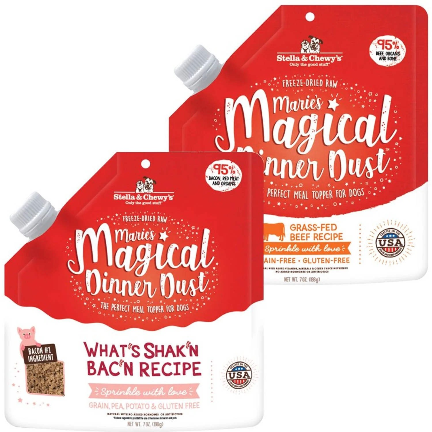 Stella & Chewy’s Marie’s Magical Dinner Dust What’s Shak’n Bac’n Recipe Freeze-Dried Raw Dog Food Topper, 7-oz Bag & Stella & Chewy’s Marie’s Magical Dinner Freeze-Dried Raw Dust Grass-Fed Beef Dog Food Topper
