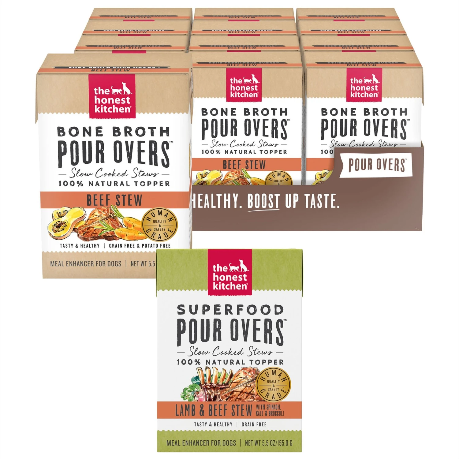 The Honest Kitchen Superfood POUR OVERS Lamb & Beef Stew with Veggies Wet Dog Food Topper, 5.5-oz, case of 12—When every day with your dog is special, mealtimes should be too. The Honest Kitchen Bone Broth POUR OVERS Lamb & Beef Stew with Veggies Wet Dog Food Topper helps change up your furry friend’s routine with some added flavor and nutrition. Your dog’s tail will start wagging for some ranch-raised lamb and beef, spinach, kale, broccoli and turmeric in a savory broth. And you’ll be happy knowing you’re treating your pooch to human-grade ingredients made in a human food facility. With a dish that’s free of artificial flavors and preservatives, GMOs, gums, carrageenan, feed-grade ingredients, meat meals and fillers—everybody say “Bone Appetit!”