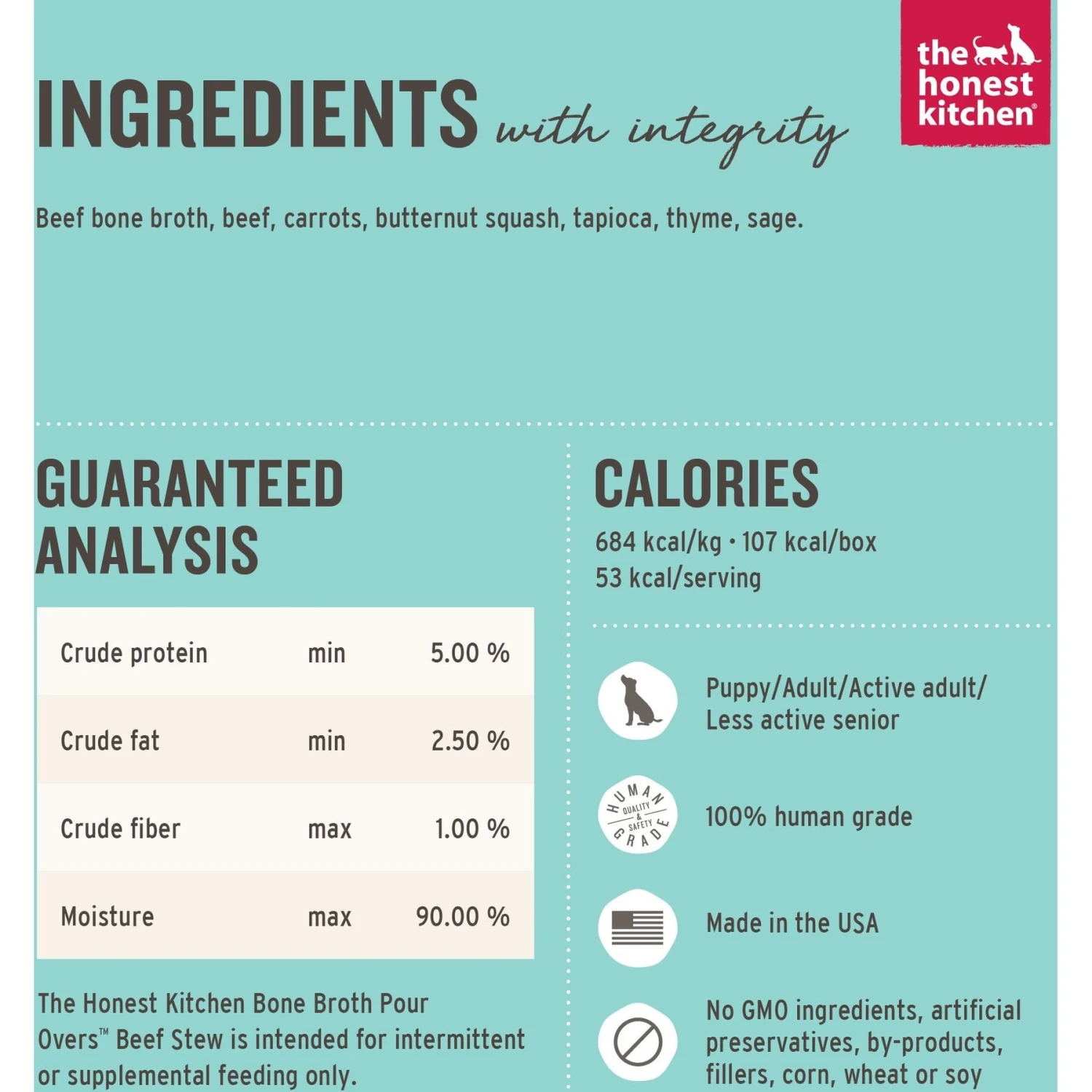 The Honest Kitchen Bone Broth POUR OVERS Beef Stew Wet Dog Food Topper, 5.5-oz, case of 12—When every day with your dog is special, mealtimes should be too. The Honest Kitchen Bone Broth POUR OVERS Beef Stew Wet Dog Food Topper helps change up your furry friend’s routine with some added flavor and nutrition. Your dog’s tail will start wagging for some ranch-raised beef and carrots in a savory bone broth. And you’ll be happy knowing you’re treating your pooch to human-grade ingredients made in a human food facility. With a dish that’s free of artificial flavors or preservatives, GMOs, gums, carrageenan, feed-grade ingredients, meat meals or fillers—everybody say “Bone Appetit!”