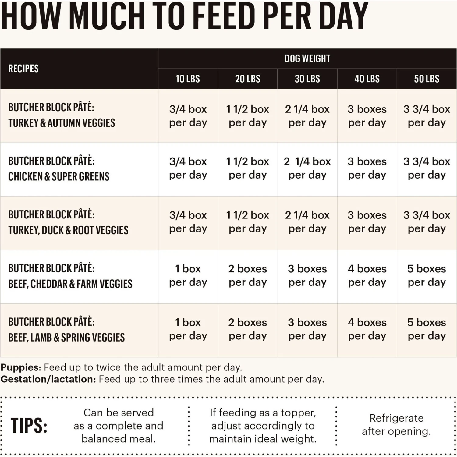 | Flavor | Turkey & Autumn Veggies, Beef, Cheddar & Farm Veggies, Turkey, Duck & Root Veggies, Beef, Lamb & Spring Veggies, Chicken & Super Greens |