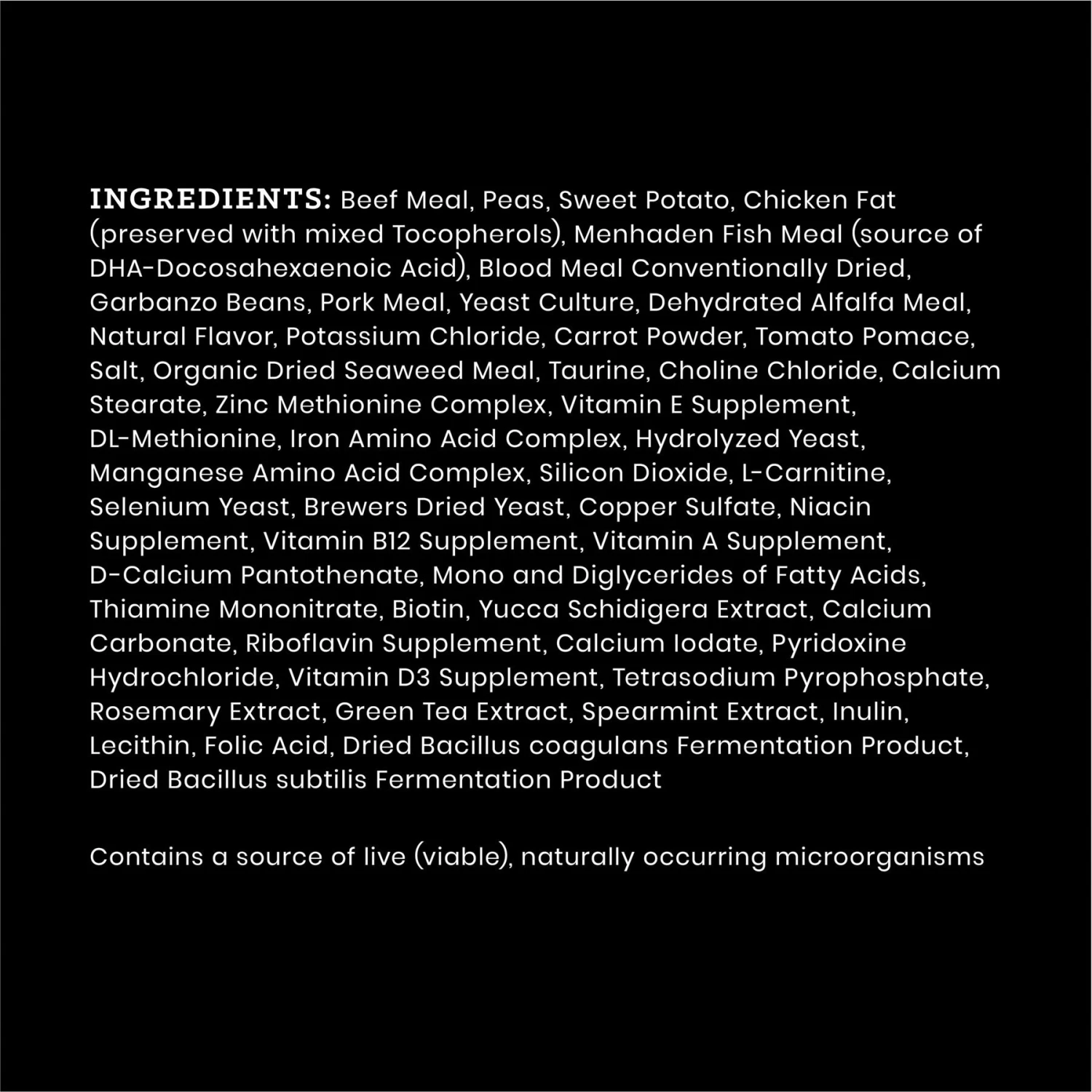 - Sourced and Made in the USA. Composed of 77% meat protein with premium-quality beef, fish and pork meals.