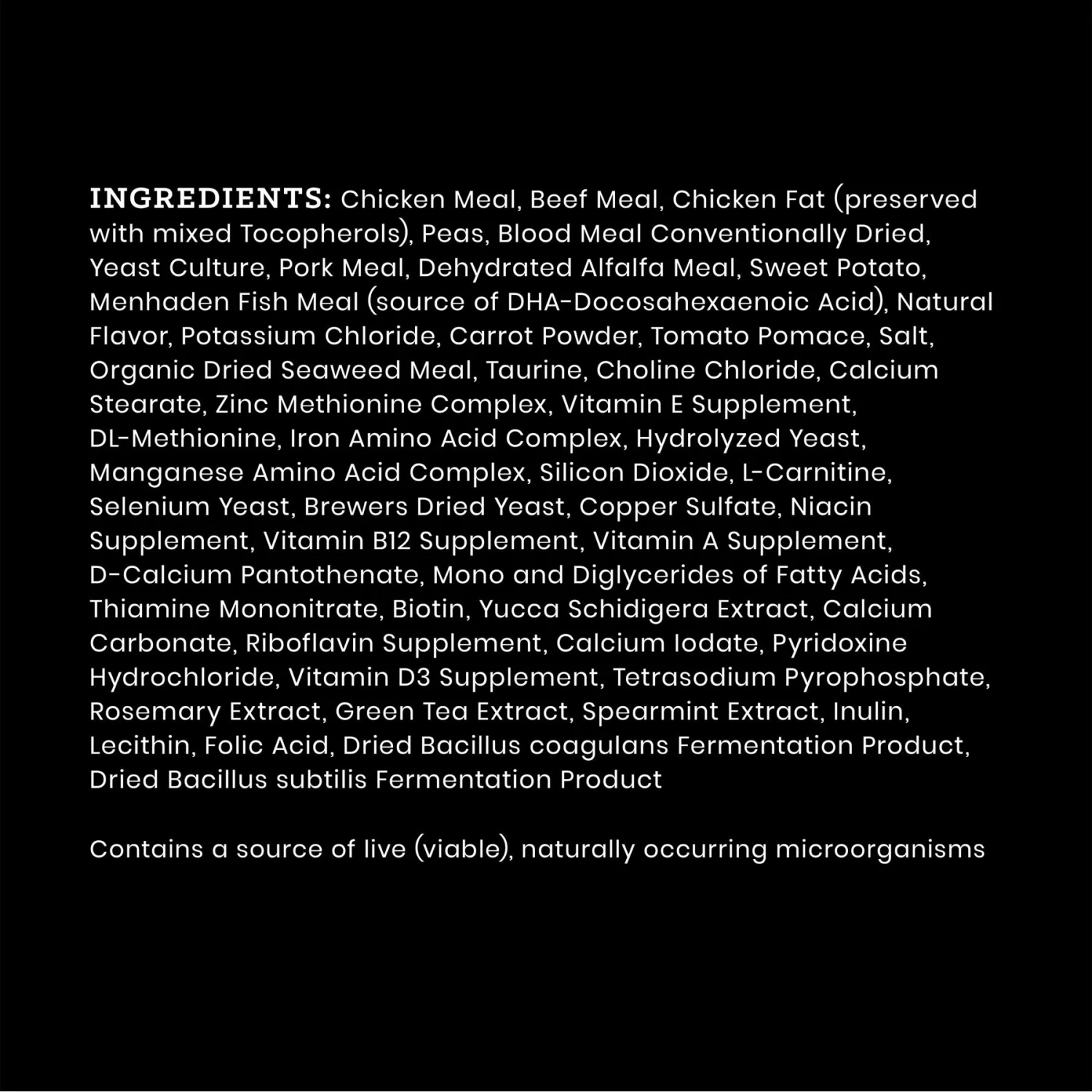 - Nutrient-dense and made with protein-rich ingredients like beef meal, chicken meal, pork meal and fish meal.