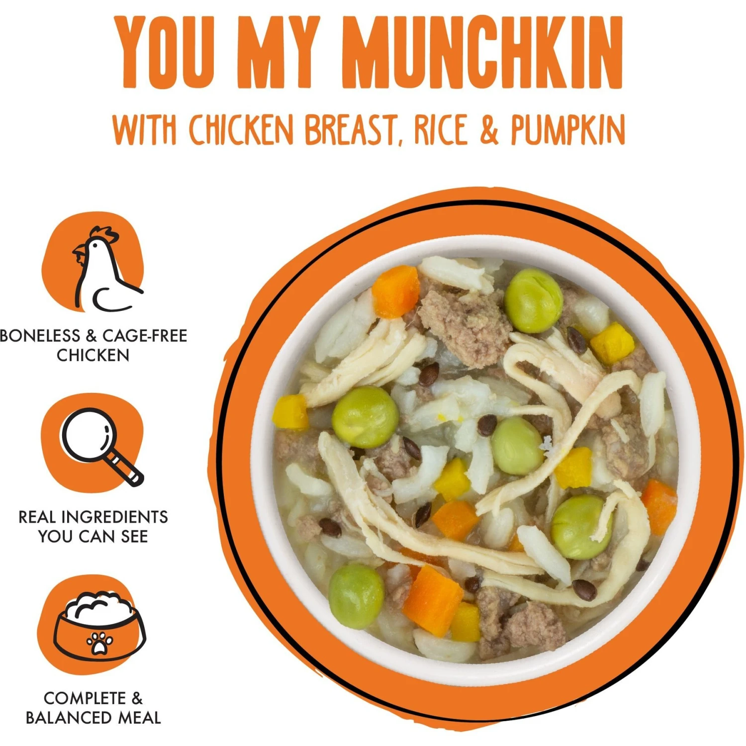 - Complete and balanced meals made with sustainably sourced, cage-free chicken and easy-to-digest rice.